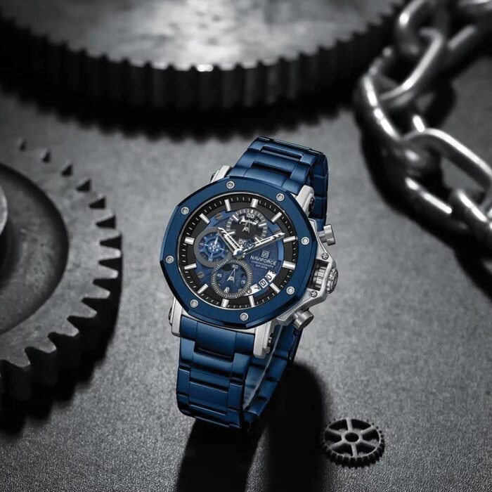 The Naviforce NF 8065 Chain for Men is a sophisticated timepiece with a 44 mm dial, encased in durable mineral glass. This watch features a Chain strap and a quartz movement originating from Japan. It offers digital and analog displays, a calendar, and a light. With a water resistance of up to 30m, it’s designed for everyday use. A blend of style and functionality, it’s the perfect accessory for the modern man