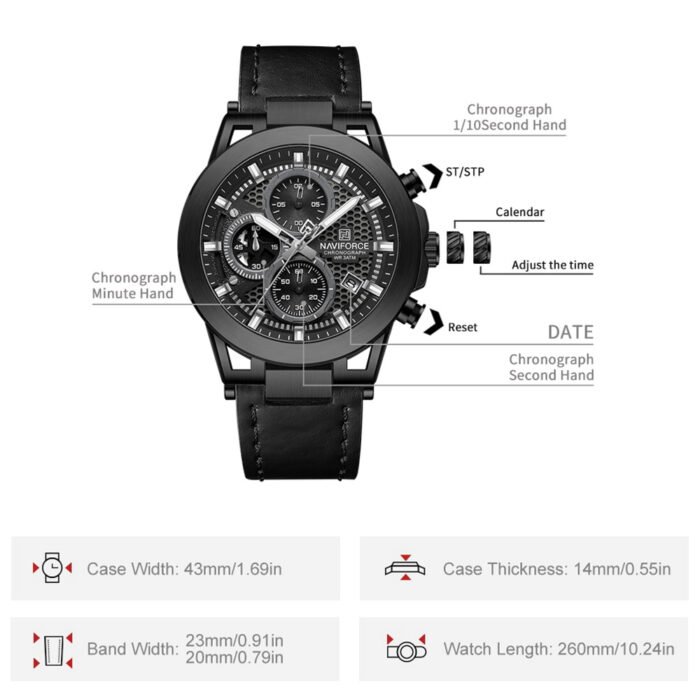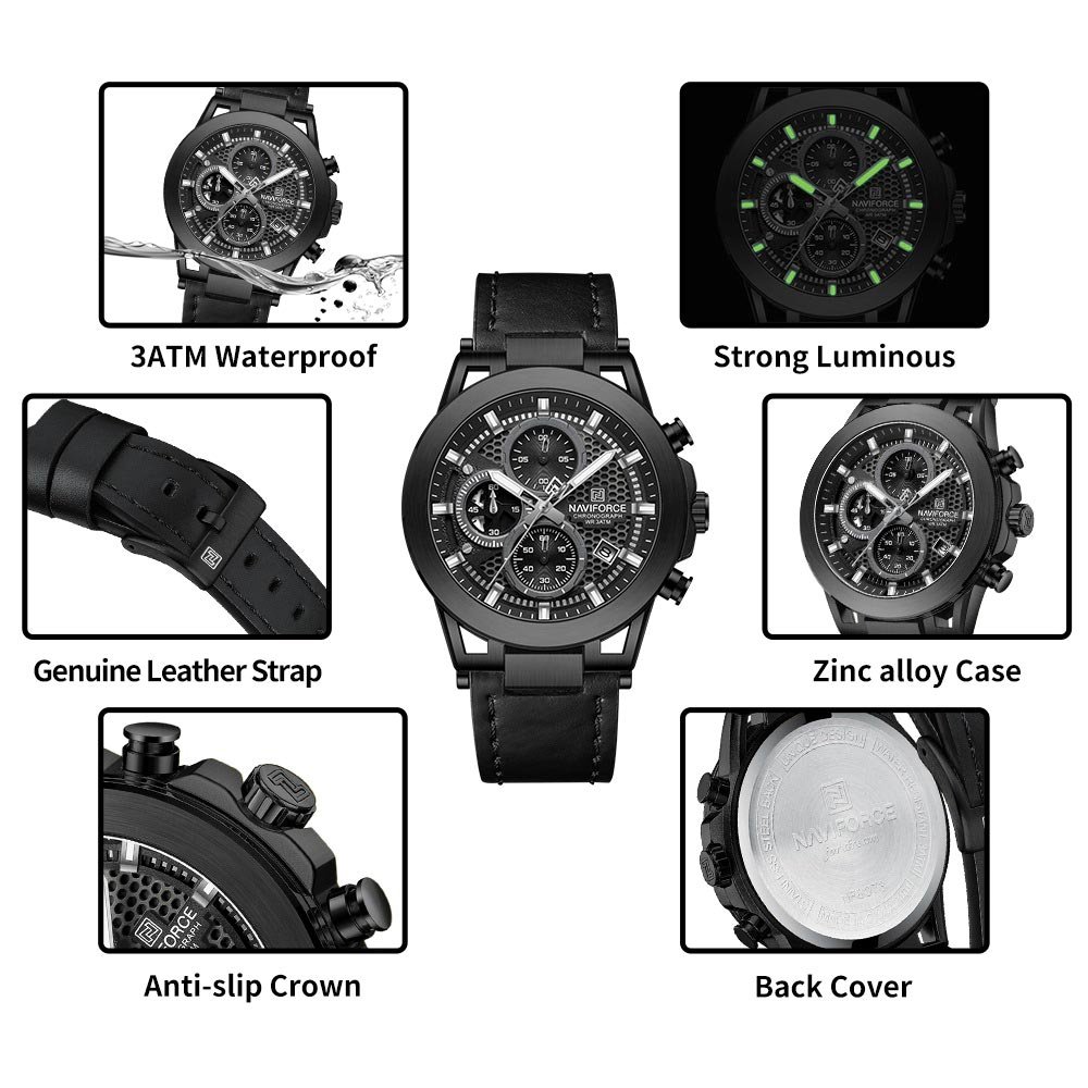 NAVIFORCE NF 8073 Black men's watch featuring a hollowed-out case design, genuine leather strap, and chronograph functionality.02NAVIFORCE NF 8073 men's watch featuring a hollowed-out case design, genuine leather strap, and chronograph functionality.02