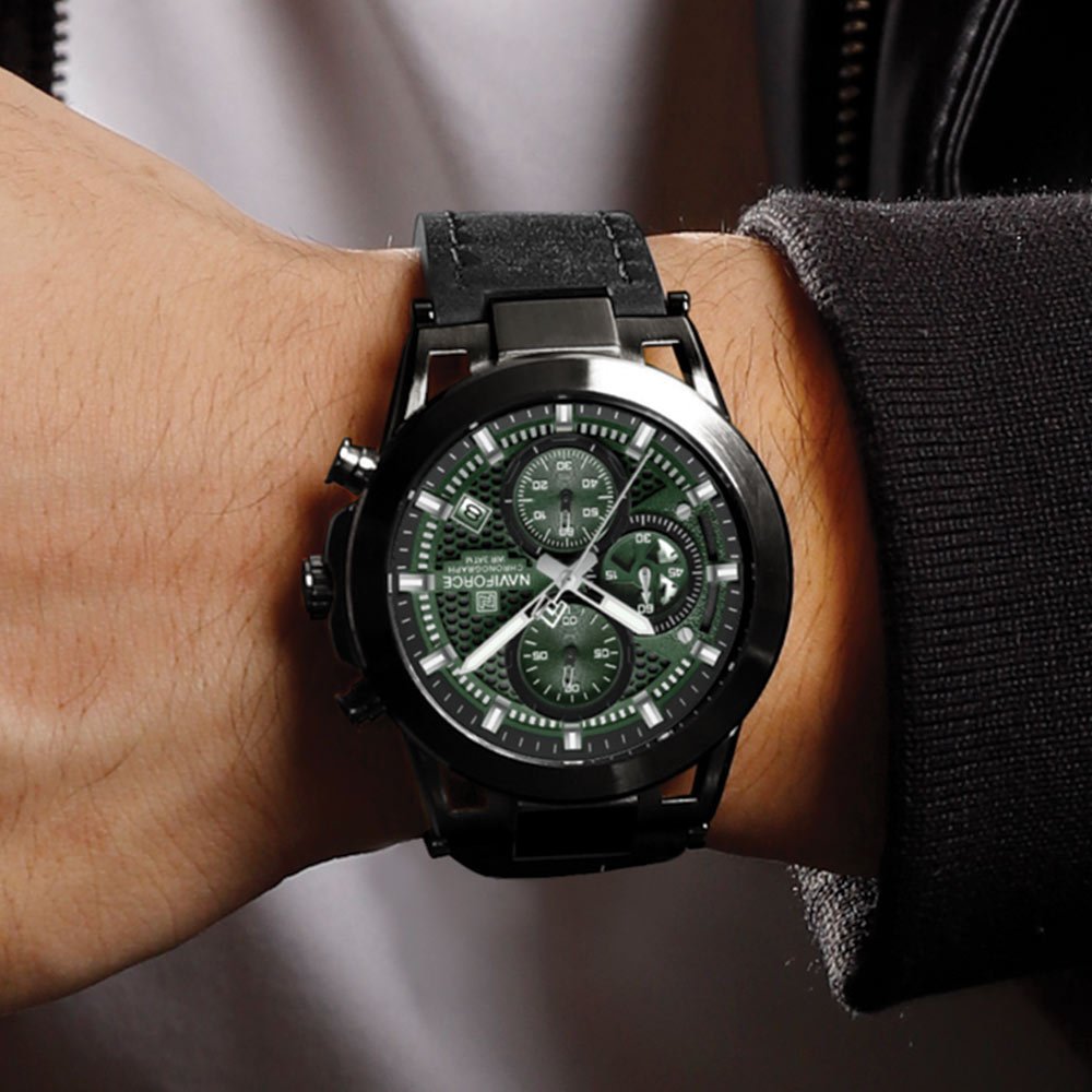 NAVIFORCE NF 8073 Green Black men's watch featuring a hollowed-out case design, genuine leather strap, and chronograph functionality.